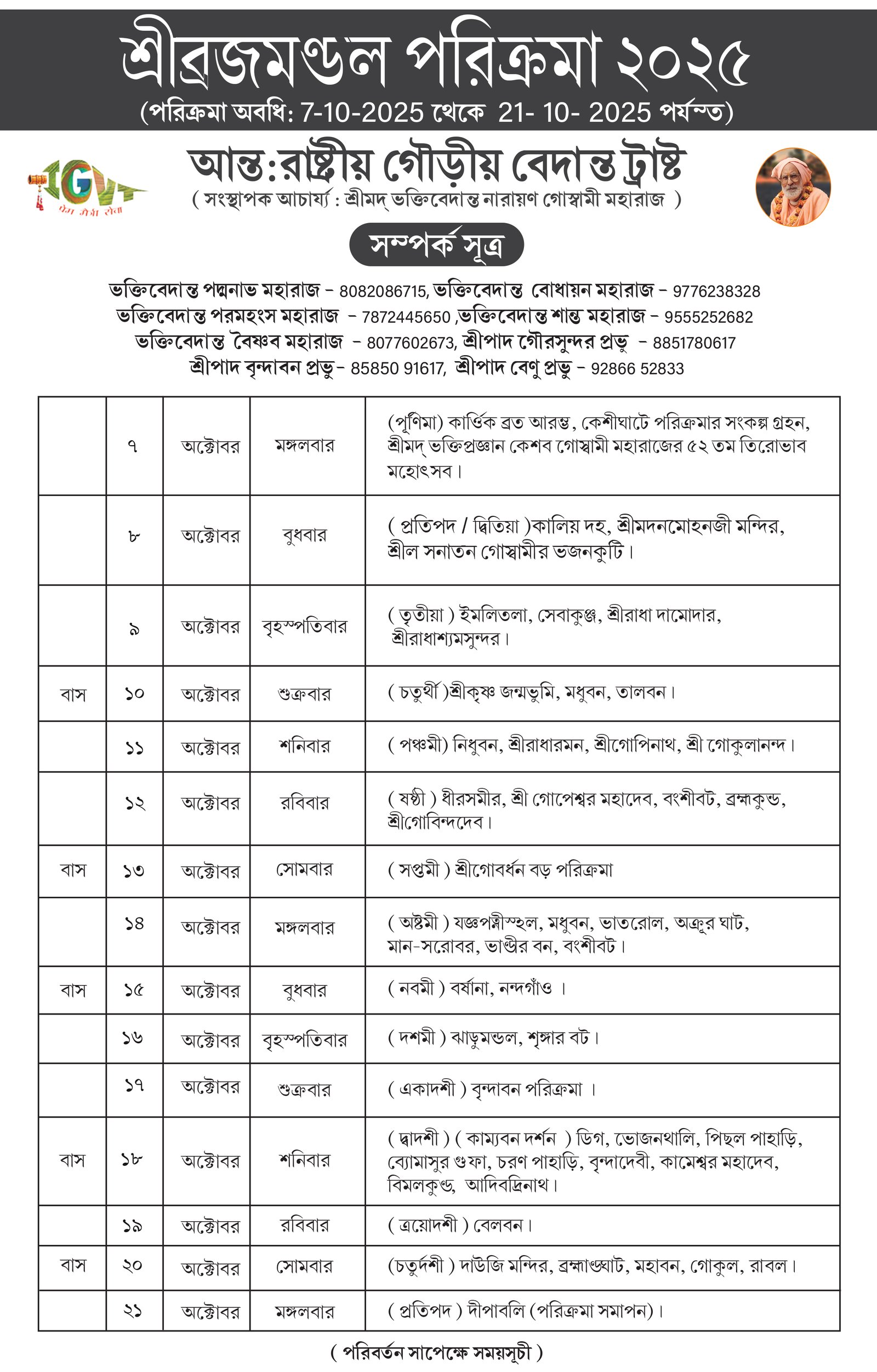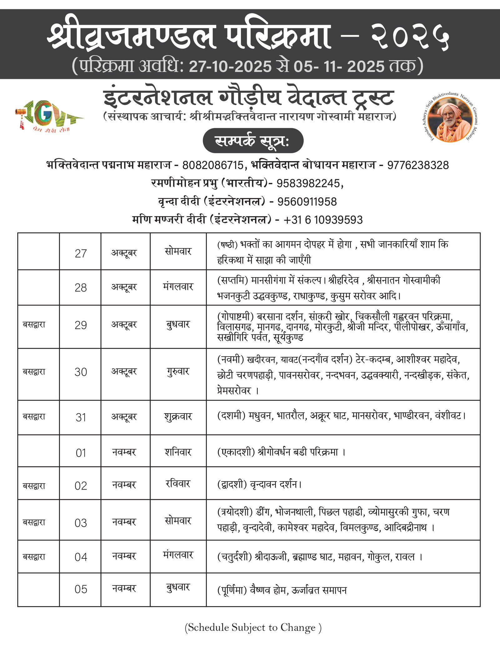 With the merciful inspiration of our most worshipable Śrīla Gurudeva, Śrī Śrīmad Bhaktivedānta Nārāyaṇa Gosvāmī Mahārāja, IGVT joyfully announces the Grand 40-Day Śrī Vraja Maṇḍala Parikramā 2025. This sacred yātrā is a once-in-a-lifetime opportunity to walk the divine dust of Vraja, where every grain echoes the pastimes of Śrī Rādhā-Kṛṣṇa and Their eternal associates.